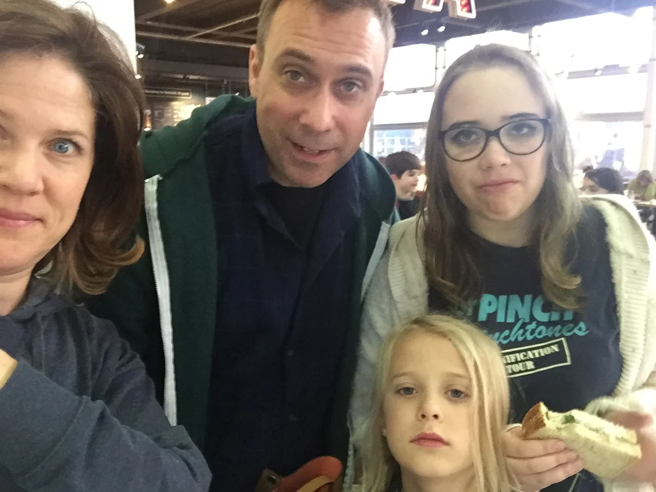 Finally arrived and waiting for our driver. He got stuck on the freeway--but it gave us just enough time to get sandwiches and some tea.